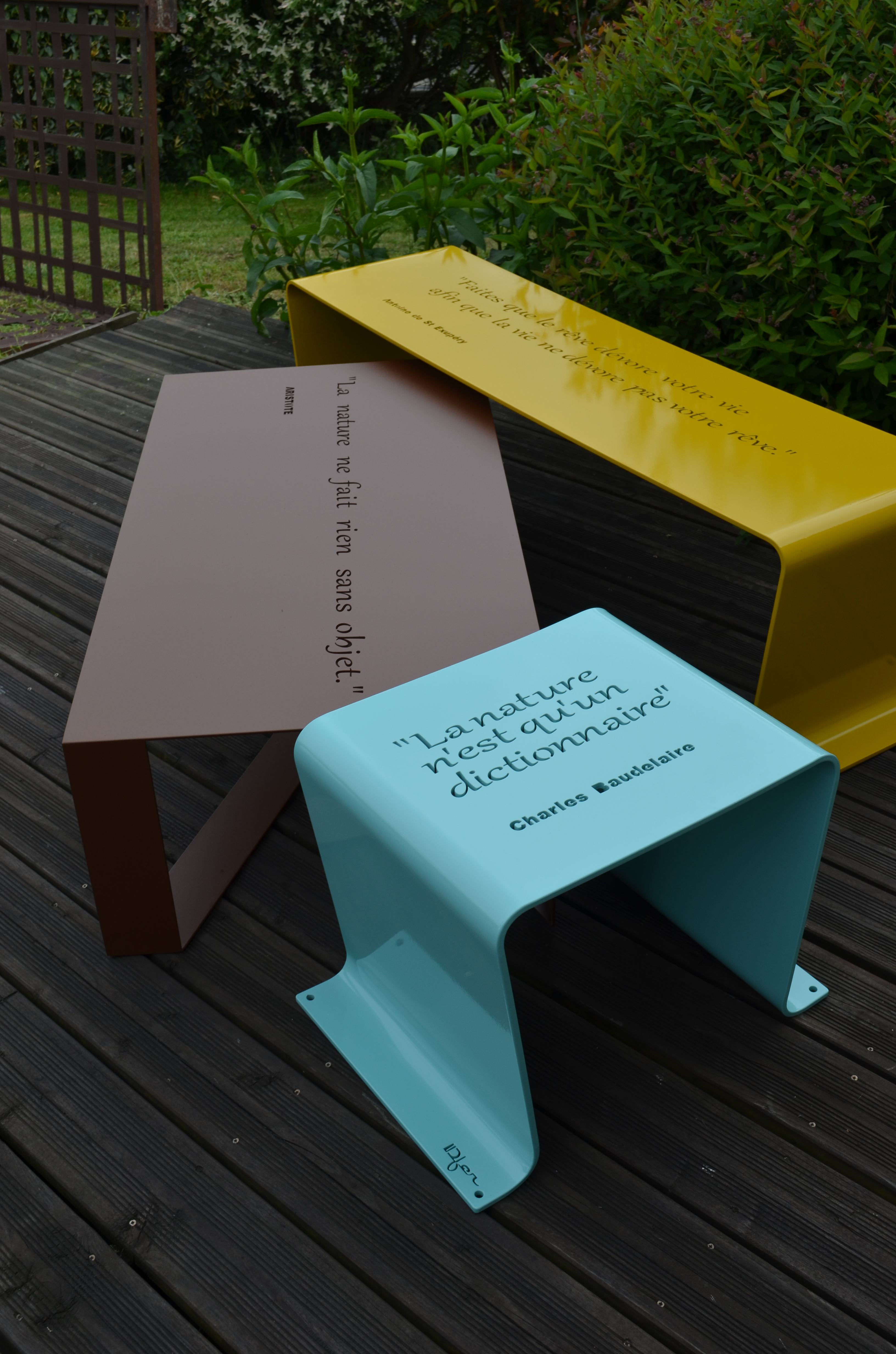 Idfer, éditeur de mobilier design en métal plié, a présenté au salon Jardins, Jardin, sa nouvelle collection Happiness inspirée par des citations positives d’auteurs philosophes. Les meubles collent aux nouveaux modes de vie… Mme Corinne Chiron, la créatrice et son designer M. Ludovic Ducasse puisent leur créativité dans la vie de tous les jours. A partir d’idées simples et pratiques, le duo a déjà prouvé qu’ils pouvaient fabriquer des pièces design qui marquent les esprits comme l’Abricocotte, le poulailler urbain, ou les chaises d’extérieur Blitz à planter ou Set One. La star de l’année sera le banc Urbansteelpersonnalisé avec une citation positive, en découpe laser.